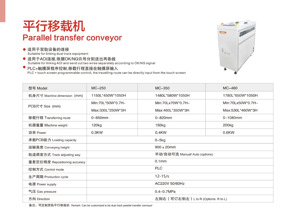 smt平行移載機(jī)介紹:適用于雙軌設(shè)備的連接;適用于AOI連接,依據(jù)OK/NG訊號分別送出兩條線;PLC+觸摸屏程序控制,移載行程直接在觸摸屏輸入。