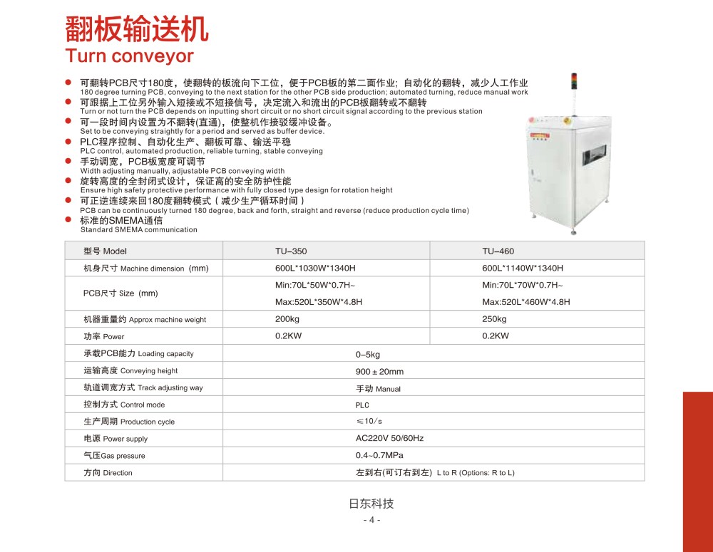 可跟據(jù)上工位另外輸入短接或不短接信號(hào), 決定流入和流出的PCB板翻轉(zhuǎn)或不翻轉(zhuǎn);
