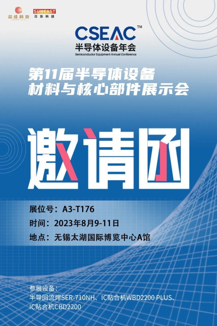 日東科技受邀參加本屆展會,將展出半導體專用回流焊、半導體封裝設備“IC貼合機”,并在810日上午的專題活動:新品發布專場,進行IC貼合機的新產品發布,歡迎您蒞臨日東展臺和新品發布會場,與我們面對面溝通交流!